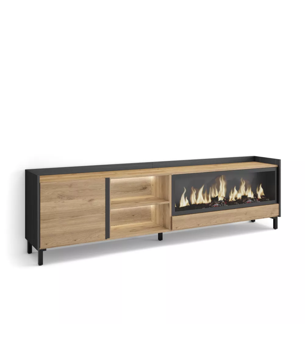 Skraut Home | Mueble TV | Televisión | Muebles de salón, almacenaje | 212x61x35 cm | Para TV hasta 80" | Chimenea eléctrica XXL | Diseño industrial | LED | Estilo Moderno | Roble y negro