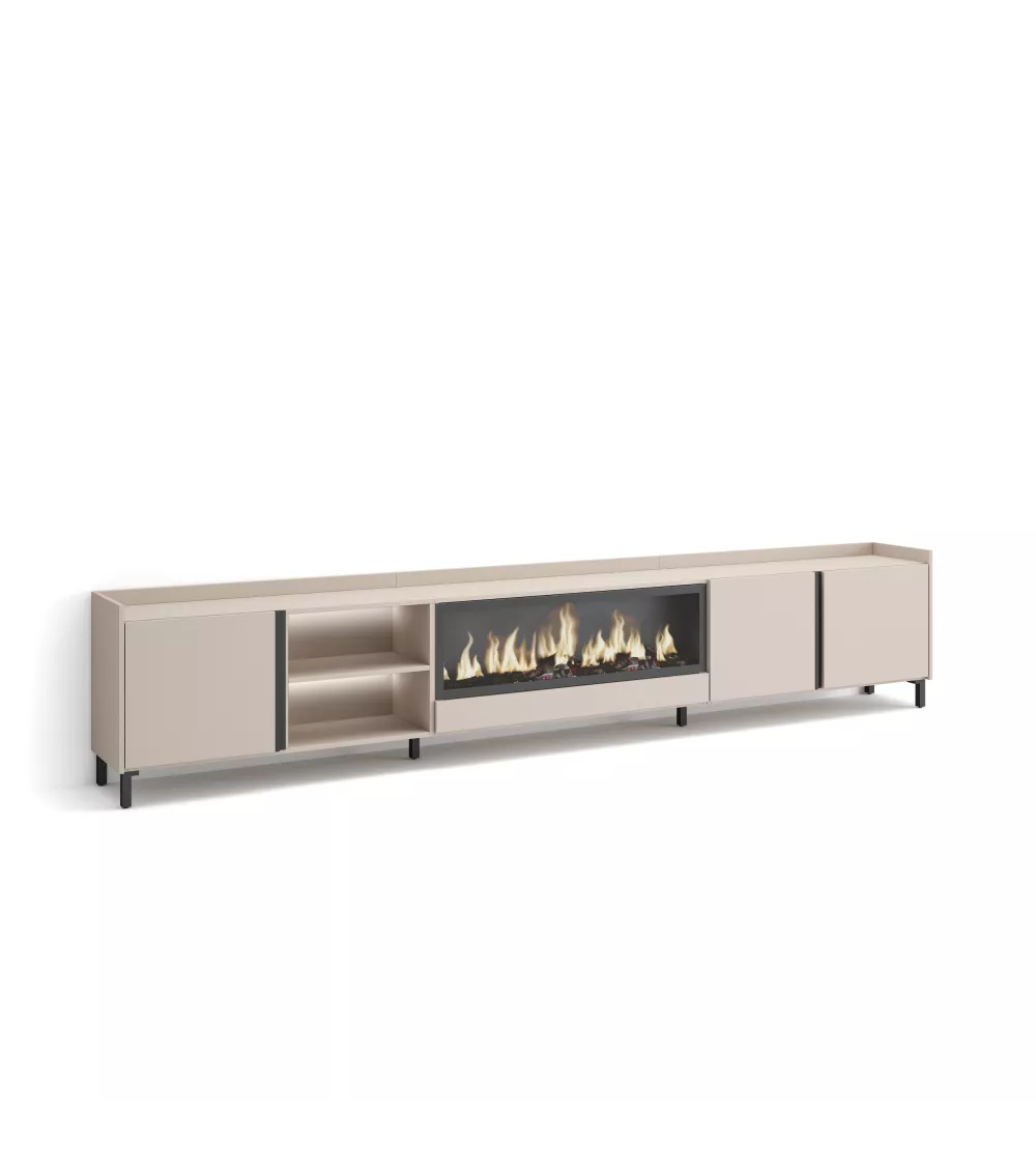Skraut Home | Mueble TV | Televisión | Muebles de salón, almacenaje | 315x61x35 cm | Para TV hasta 80" | Chimenea eléctrica XXL | Diseño industrial | LED | Estilo Moderno | Beige