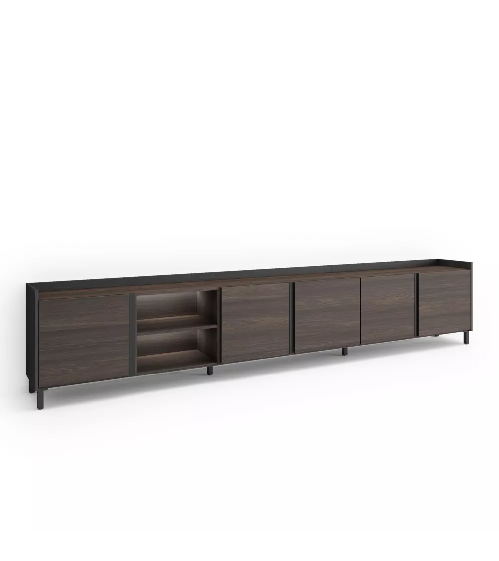 Skraut Home | Mueble TV | Televisión | Muebles de salón, almacenaje | 309x61x35 cm | Para TV hasta 80" | Diseño industrial | LED | Estilo Moderno | Roble oscuro y Negro