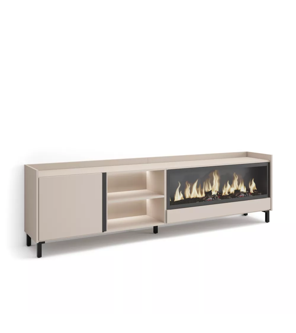 Chimenea Eléctrica LED. Medidas: 107cm. de Ancho, 32cm. de Alto. Efecto de fuego 3D increíblemente realista. Sin riesgos de quemaduras ya que no incorpora ninguna fuente de calor. Potencia: 34w. Incluye mando a distancia y 3 niveles de intensidad. La chimenea eléctrica funciona conectada a la electricidad. El mando a distancia requiere pilas, que no están incluidas. Pata de 10.5cm ajustable en altura. Color negro Interruptor tactil oculto. Luz led blanco neutro, con regulador de intensidad Módulo TV con hueco . Medidas del Módulo: 109cm. de Ancho, 50cm. de Alto, 35 cm. de Profundidad. Color beige Módulo Tv con hueco para almacenar sus dispositivos electrónicos y puerta abatible. Bisagras con cierre soft. Tiradores de aluminio. Medidas del Módulo: 103 cm. de Ancho, 50cm. de Alto, 35cm. de Profundidad. Color beige