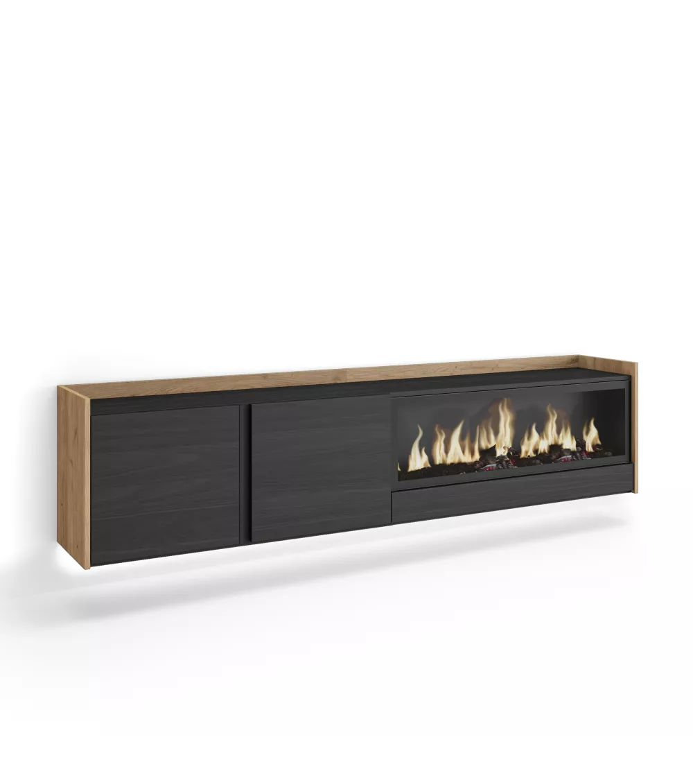 Skraut Home | Mueble TV | Televisión | Muebles de salón, almacenaje | 212x50x35 cm | Para TV hasta 80" | Chimenea eléctrica XXL | Colgado, Suspendido | LED | Estilo Moderno | Negro y roble