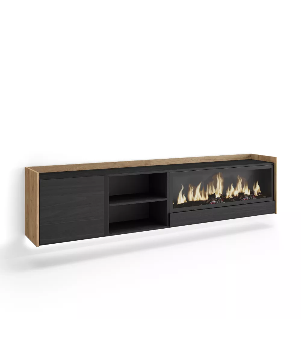 Skraut Home | Mueble TV | Televisión | Muebles de salón, almacenaje | 212x50x35 cm | Para TV hasta 80" | Chimenea eléctrica XXL | Colgado, Suspendido | LED | Estilo Moderno | Negro y roble