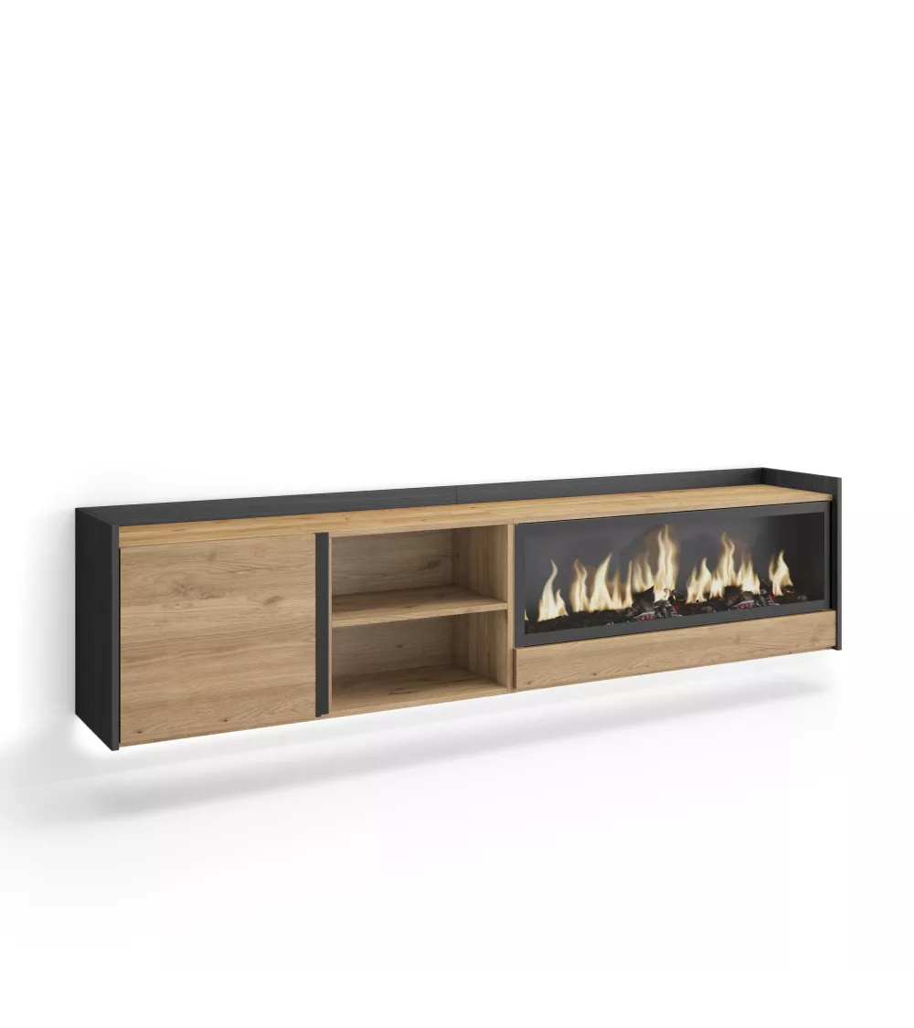 Chimenea Eléctrica LED. Medidas: 107cm. de Ancho, 32cm. de Alto. Efecto de fuego 3D increíblemente realista. Sin riesgos de quemaduras ya que no incorpora ninguna fuente de calor. Potencia: 34w. Incluye mando a distancia y 3 niveles de intensidad. La chimenea eléctrica funciona conectada a la electricidad. El mando a distancia requiere pilas, que no están incluidas. Módulo Tv con hueco para almacenar sus dispositivos electrónicos y puerta abatible. Bisagras con cierre soft. Tiradores de aluminio. Medidas del Módulo: 103 cm. de Ancho, 50cm. de Alto, 35cm. de Profundidad. Color roble y negro con veteado de madera de tacto poroso de alta calidad. Interruptor tactil oculto. Luz led blanco neutro, con regulador de intensidad Módulo TV con hueco . Medidas del Módulo: 109cm. de Ancho, 50cm. de Alto, 35 cm. de Profundidad. Color roble y negro con veteado de madera de tacto poroso de alta calidad.
