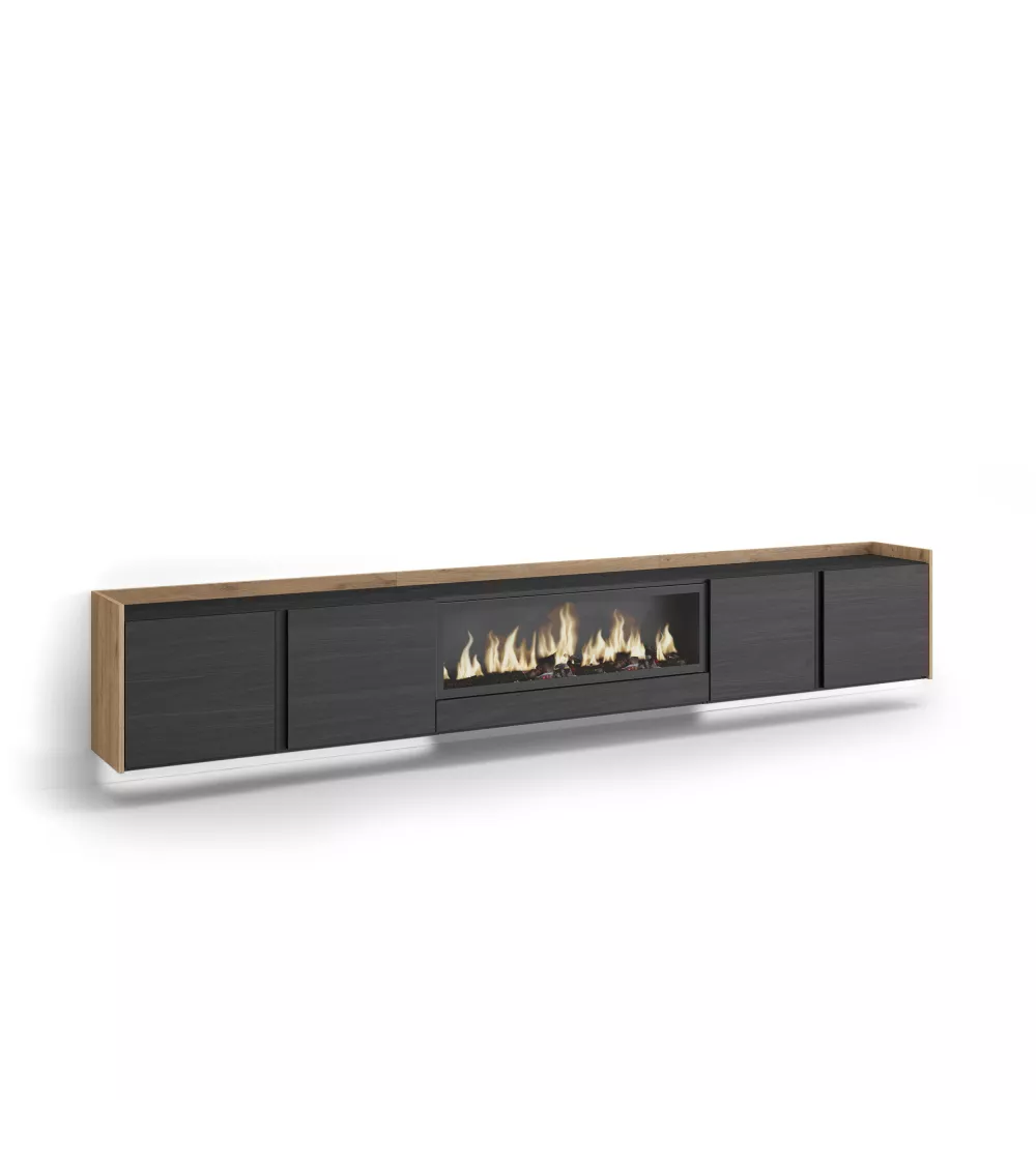 Mueble TV con chimenea eléctrica, suspendido y luz LED