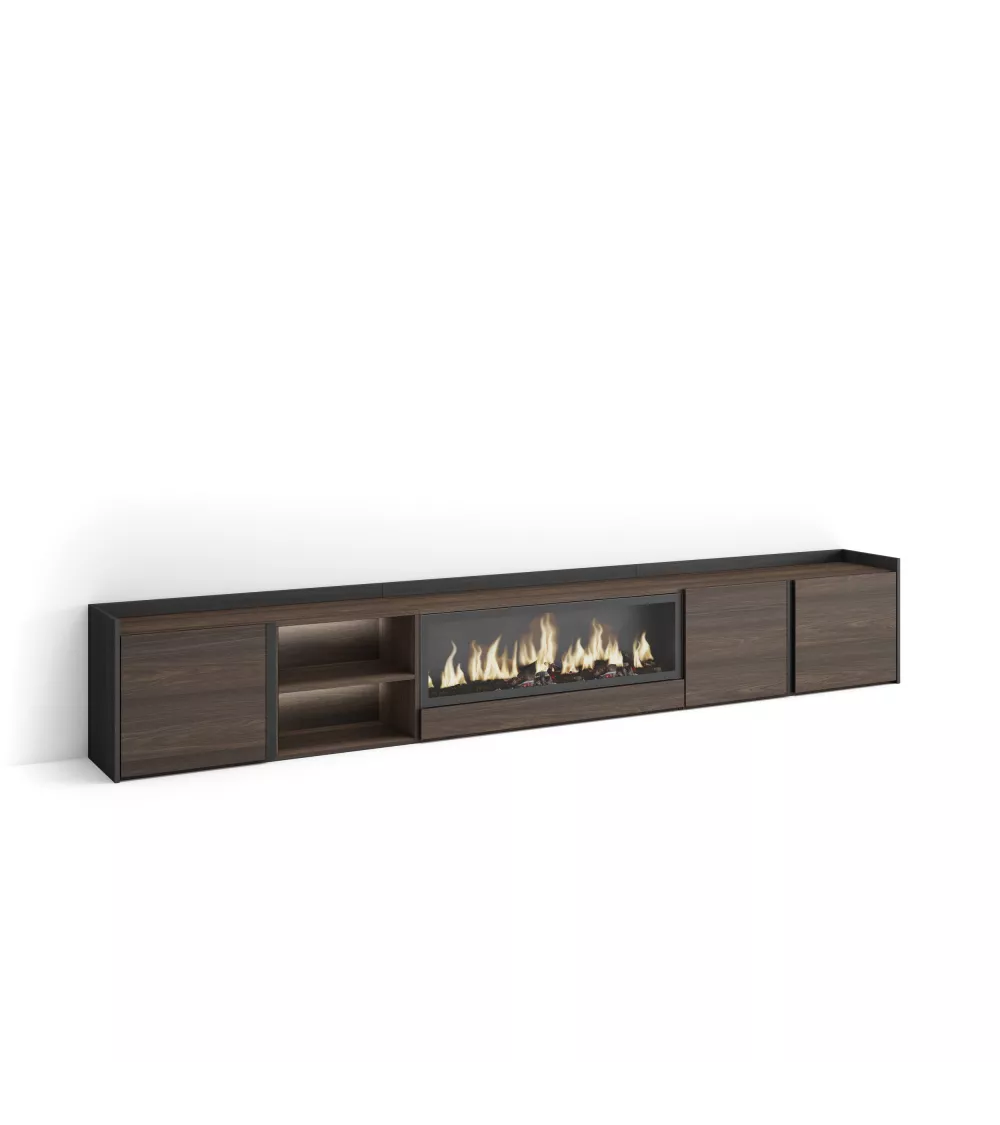Skraut Home | Mueble TV | Televisión | Muebles de salón, almacenaje | 315x50x35 cm | Para TV hasta 80" | Chimenea eléctrica XXL | LED | Estilo Moderno | Roble oscuro y Negro