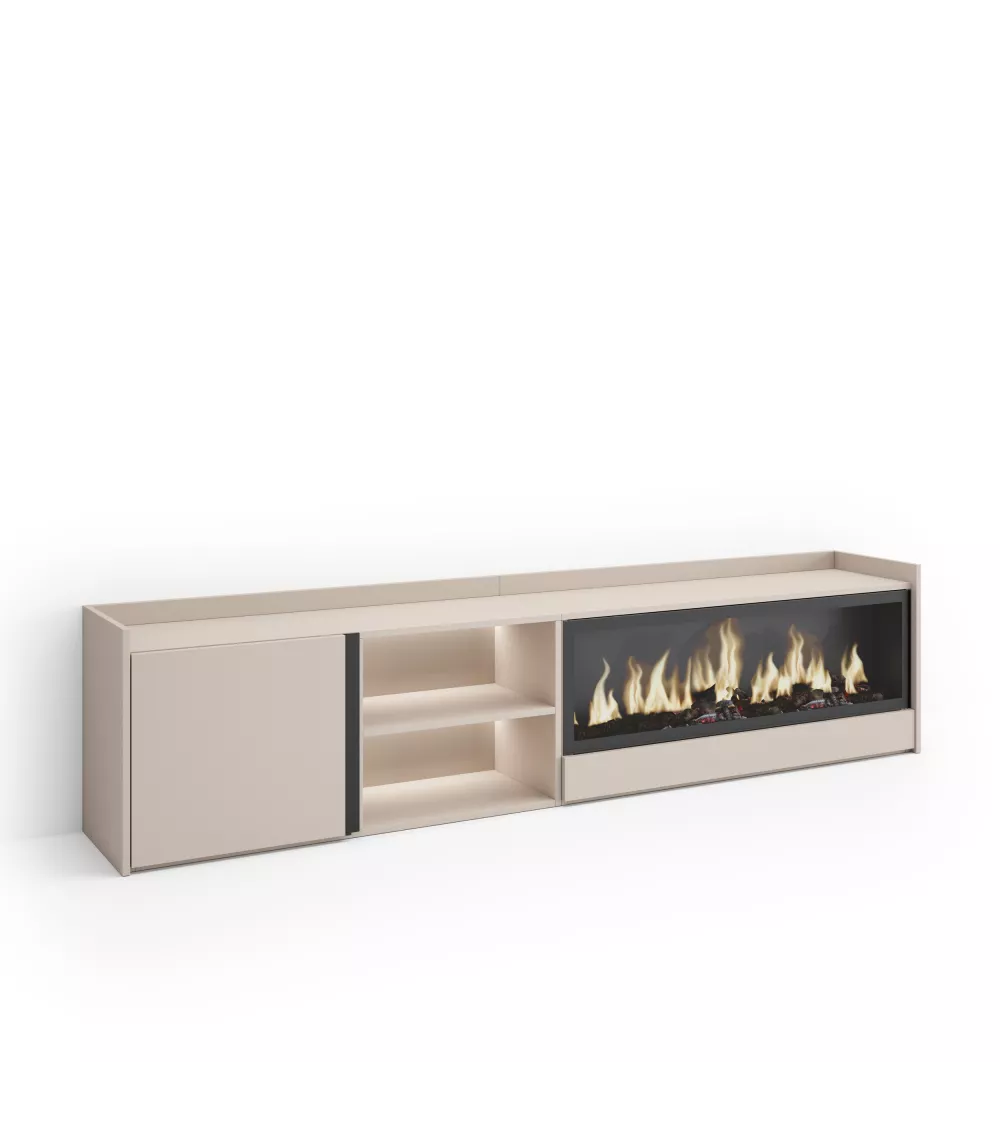 Chimenea Eléctrica LED. Medidas: 107cm. de Ancho, 32cm. de Alto. Efecto de fuego 3D increíblemente realista. Sin riesgos de quemaduras ya que no incorpora ninguna fuente de calor. Potencia: 34w. Incluye mando a distancia y 3 niveles de intensidad. La chimenea eléctrica funciona conectada a la electricidad. El mando a distancia requiere pilas, que no están incluidas. Interruptor tactil oculto. Luz led blanco neutro, con regulador de intensidad Módulo TV con hueco . Medidas del Módulo: 109cm. de Ancho, 50cm. de Alto, 35 cm. de Profundidad. Color beige Módulo Tv con hueco para almacenar sus dispositivos electrónicos y puerta abatible. Bisagras con cierre soft. Tiradores de aluminio. Medidas del Módulo: 103 cm. de Ancho, 50cm. de Alto, 35cm. de Profundidad. Color beige