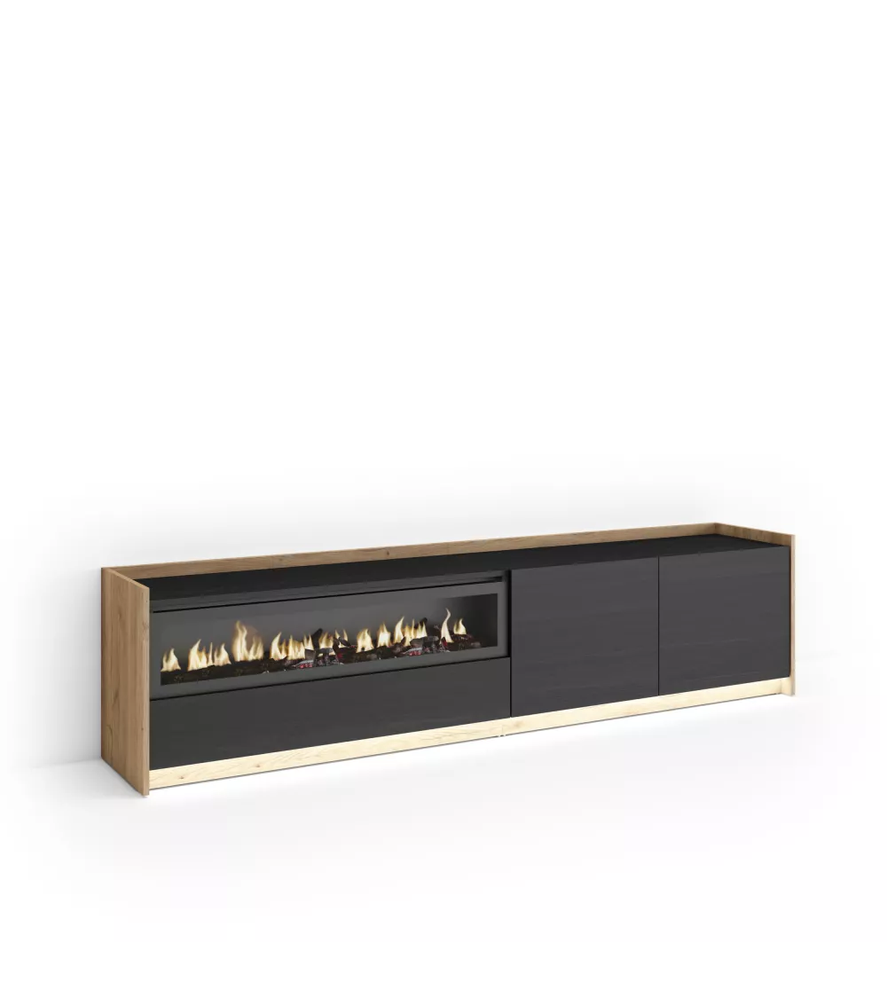 Skraut Home | Mueble TV | Televisión | Muebles de salón, almacenaje | 207x50x37 cm | Para TV hasta 80" | Chimenea eléctrica | LED | Estilo Moderno | Negro y roble