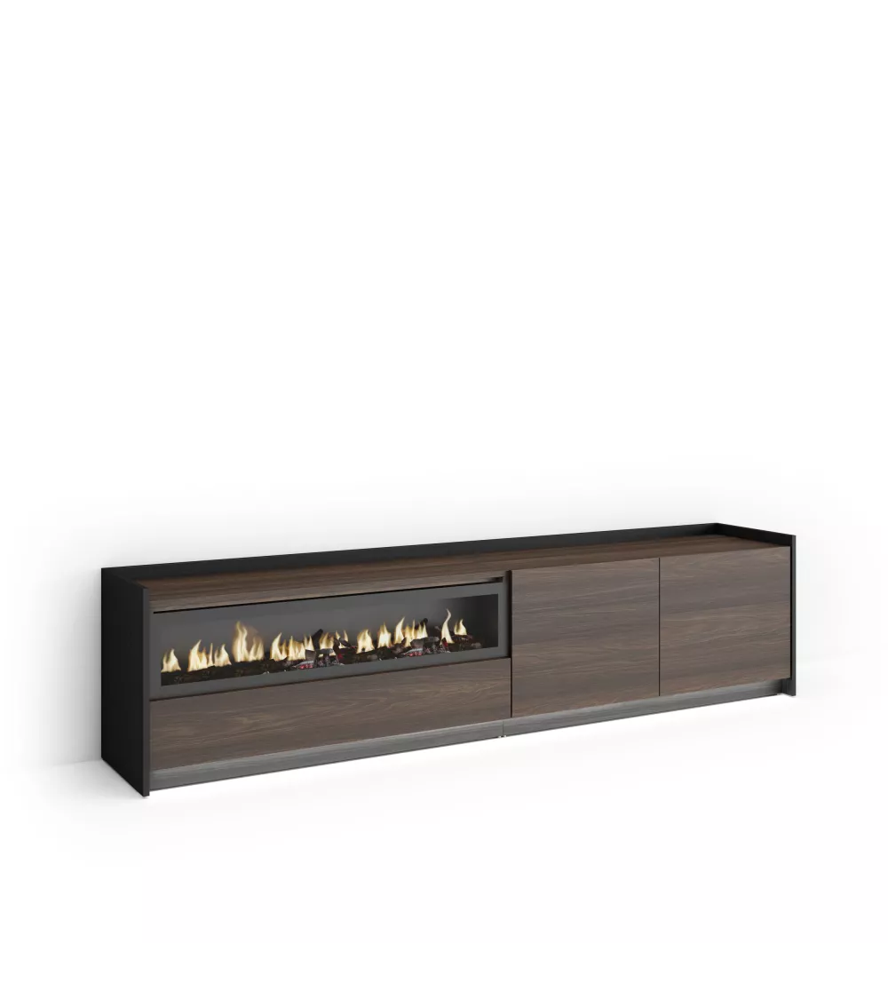 Skraut Home | Mueble TV | Televisión | Muebles de salón, almacenaje | 207x50x37 cm | Para TV hasta 80" | Chimenea eléctrica | LED | Estilo Moderno | Roble oscuro y Negro