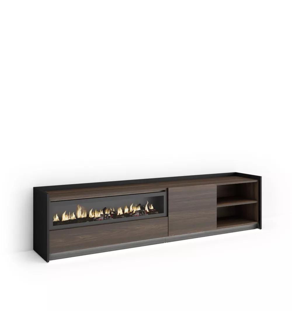 Skraut Home | Mueble TV | Televisión | Muebles de salón, almacenaje | 207x50x37 cm | Para TV hasta 80" | Chimenea eléctrica | LED | Estilo Moderno | Roble oscuro y Negro