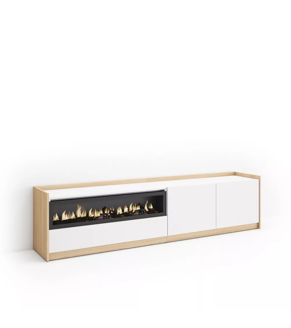 Skraut Home | Mueble TV | Televisión | Muebles de salón, almacenaje | 207x50x37 cm | Para TV hasta 80" | Chimenea eléctrica | Estilo Moderno | Blanco y roble soft