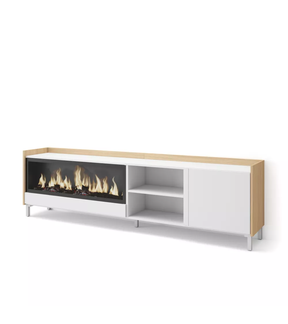 Skraut Home | Mueble TV | Televisión | Muebles de salón, almacenaje | 212x61x35 cm | Para TV hasta 80" | Chimenea eléctrica XXL | Diseño industrial | Estilo Moderno | Blanco y roble soft