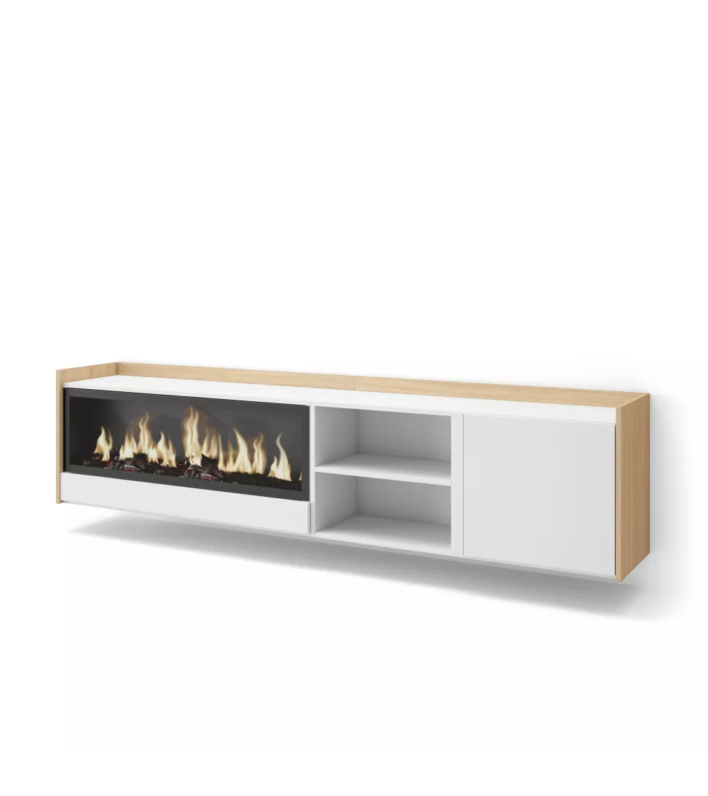 Skraut Home | Mueble TV | Televisión | Muebles de salón, almacenaje | 212x50x35 cm | Para TV hasta 80" | Chimenea eléctrica XXL | Colgado, Suspendido | Estilo Moderno | Blanco y roble soft