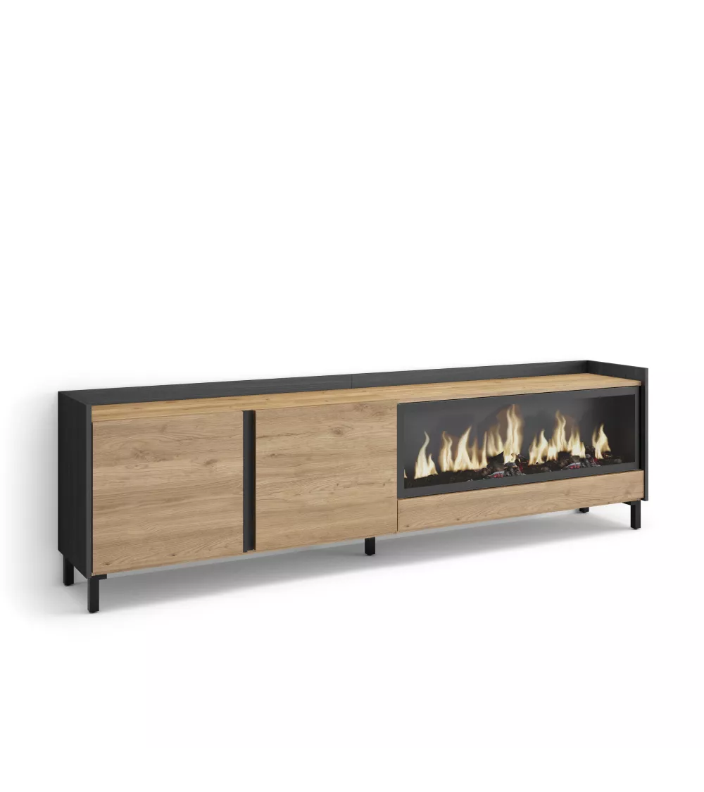 Skraut Home | Mueble TV | Televisión | Muebles de salón, almacenaje | 212x61x35 cm | Para TV hasta 80" | Chimenea eléctrica XXL | Diseño industrial | Estilo Moderno | Roble y negro