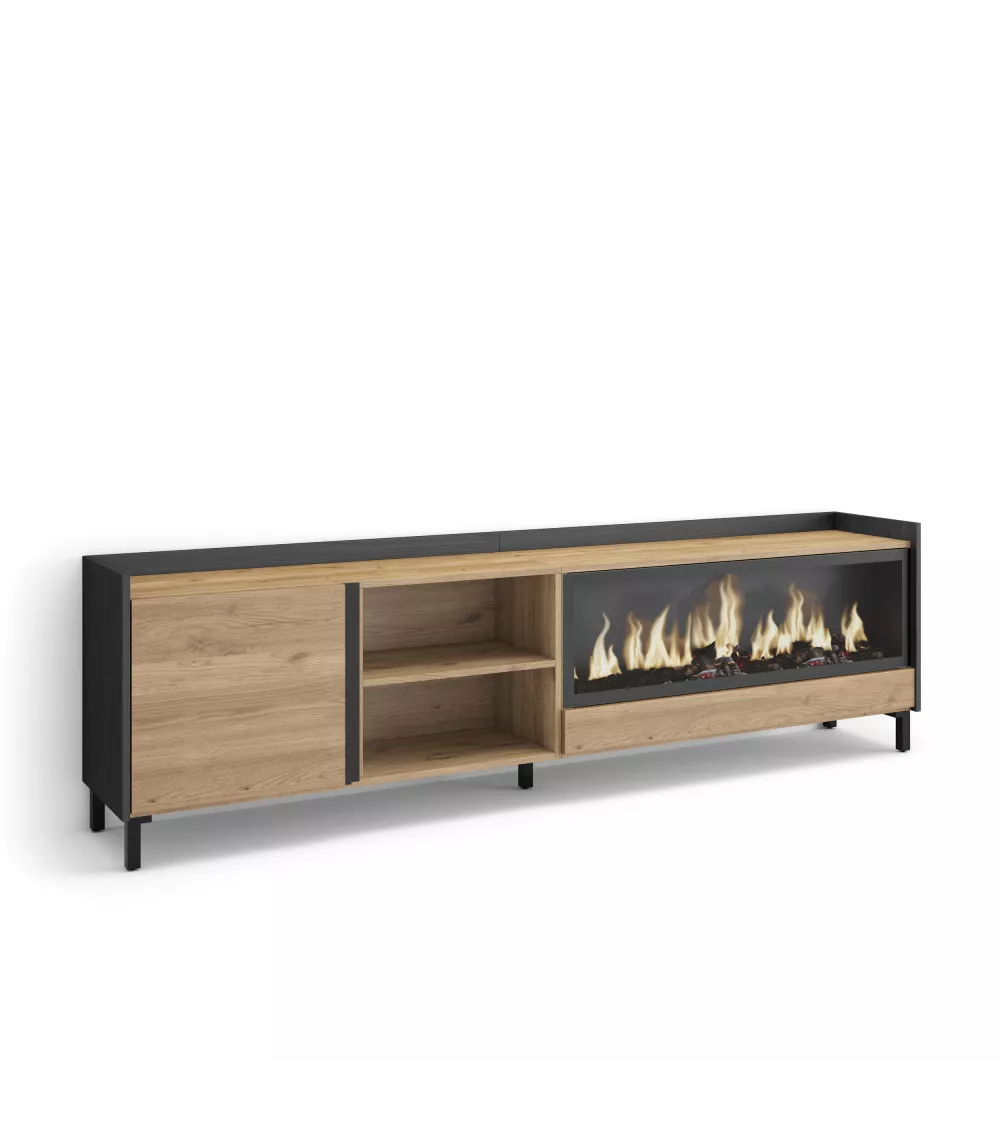 Skraut Home | Mueble TV | Televisión | Muebles de salón, almacenaje | 212x61x35 cm | Para TV hasta 80" | Chimenea eléctrica XXL | Diseño industrial | Estilo Moderno | Roble y negro