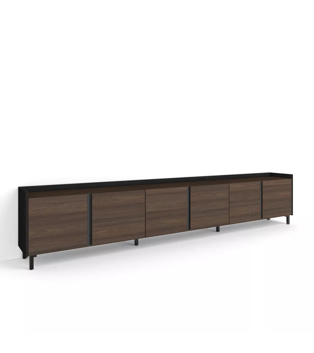 Pata de 10.5cm ajustable en altura. Color negro Módulo Tv con puertas abatibles y gran capacidad de almacenaje. Bisagras con cierre soft. Tiradores de aluminio. Medidas del Módulo: 103 cm. de Ancho, 50cm. de Alto, 35cm. de Profundidad. Color roble oscuro y negro con veteado de madera de tacto poroso de alta calidad.