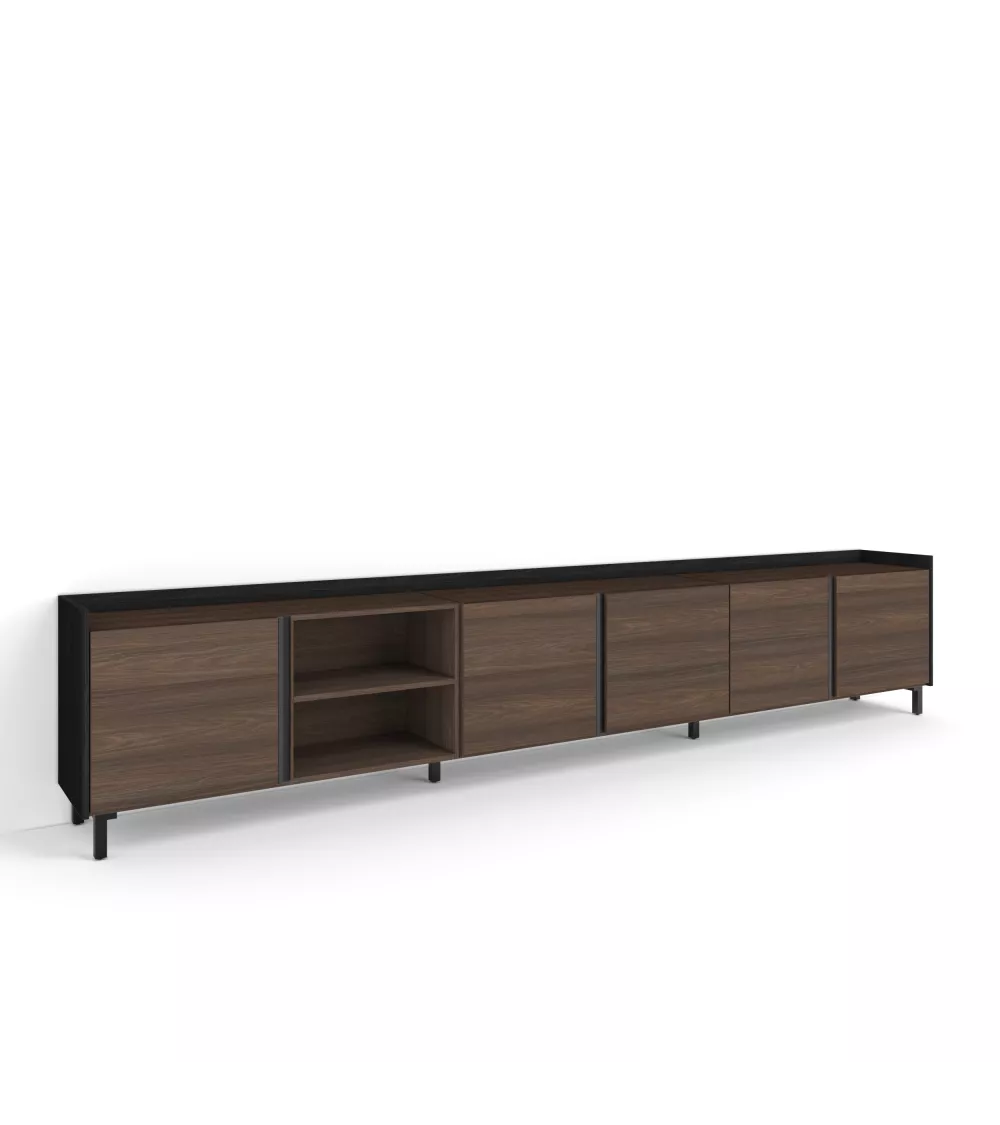 Skraut Home | Mueble TV | Televisión | Muebles de salón, almacenaje | 309x61x35 cm | Para TV hasta 80" | Diseño industrial | Estilo Moderno | Roble oscuro y Negro