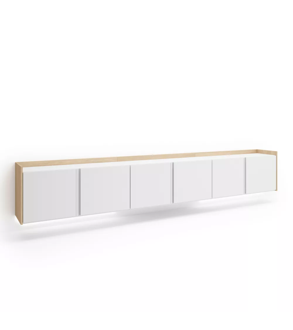 Skraut Home | Mueble TV | Televisión | Muebles de salón, almacenaje | 309x50x35 cm | Para TV hasta 80" | Colgado, Suspendido | LED | Estilo Moderno | Blanco y roble soft