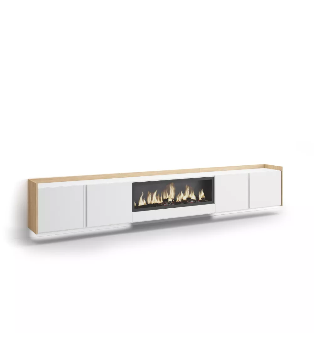 Skraut Home | Mueble TV | Televisión | Muebles de salón, almacenaje | 315x50x35 cm | Para TV hasta 80" | Chimenea eléctrica XXL | Colgado, Suspendido | LED | Estilo Moderno | Blanco y roble soft