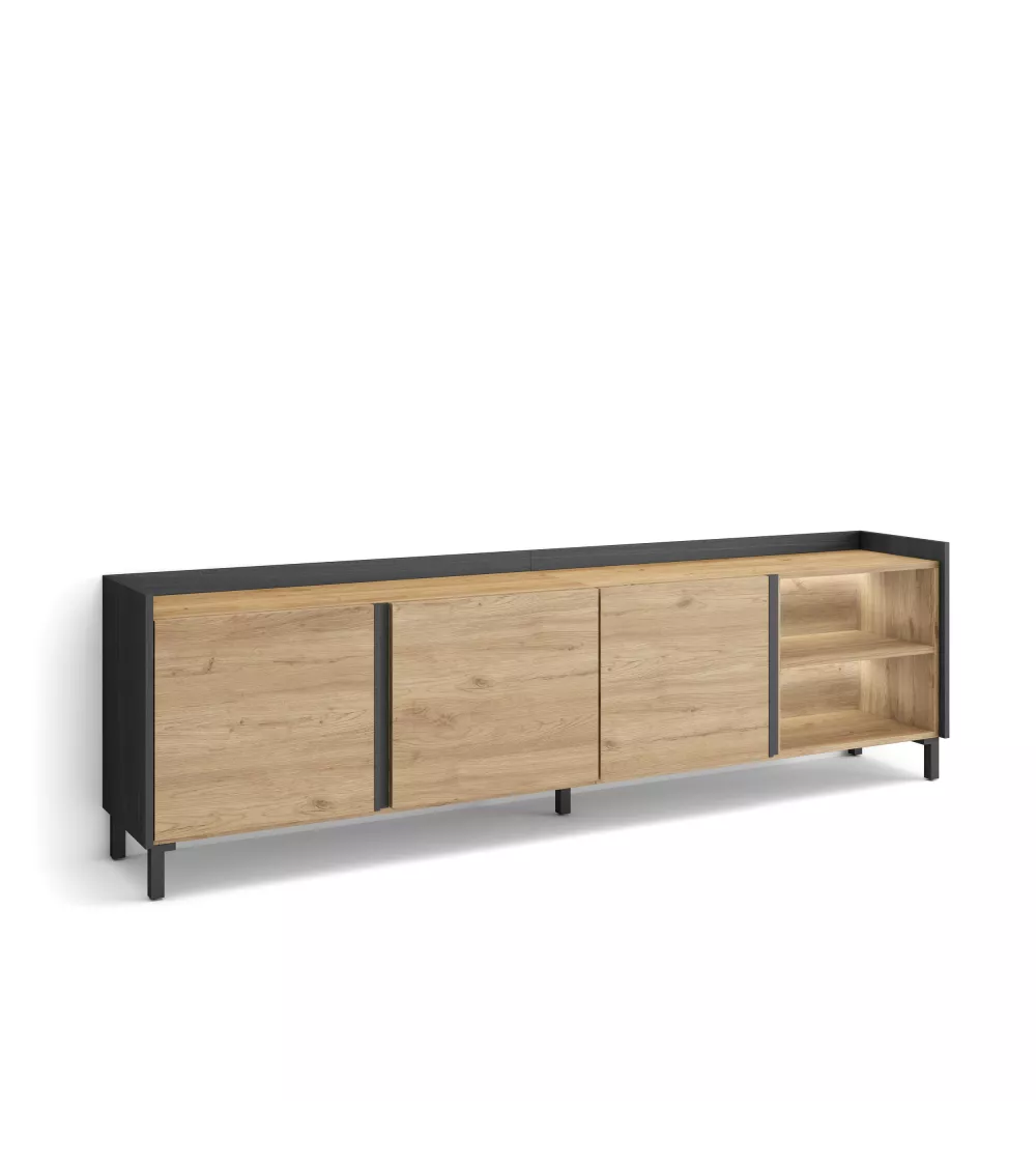 Skraut Home | Mueble TV | Televisión | Muebles de salón, almacenaje | 207x61x35 cm | Para TV hasta 80" | Diseño industrial | LED | Estilo Moderno | Roble y negro