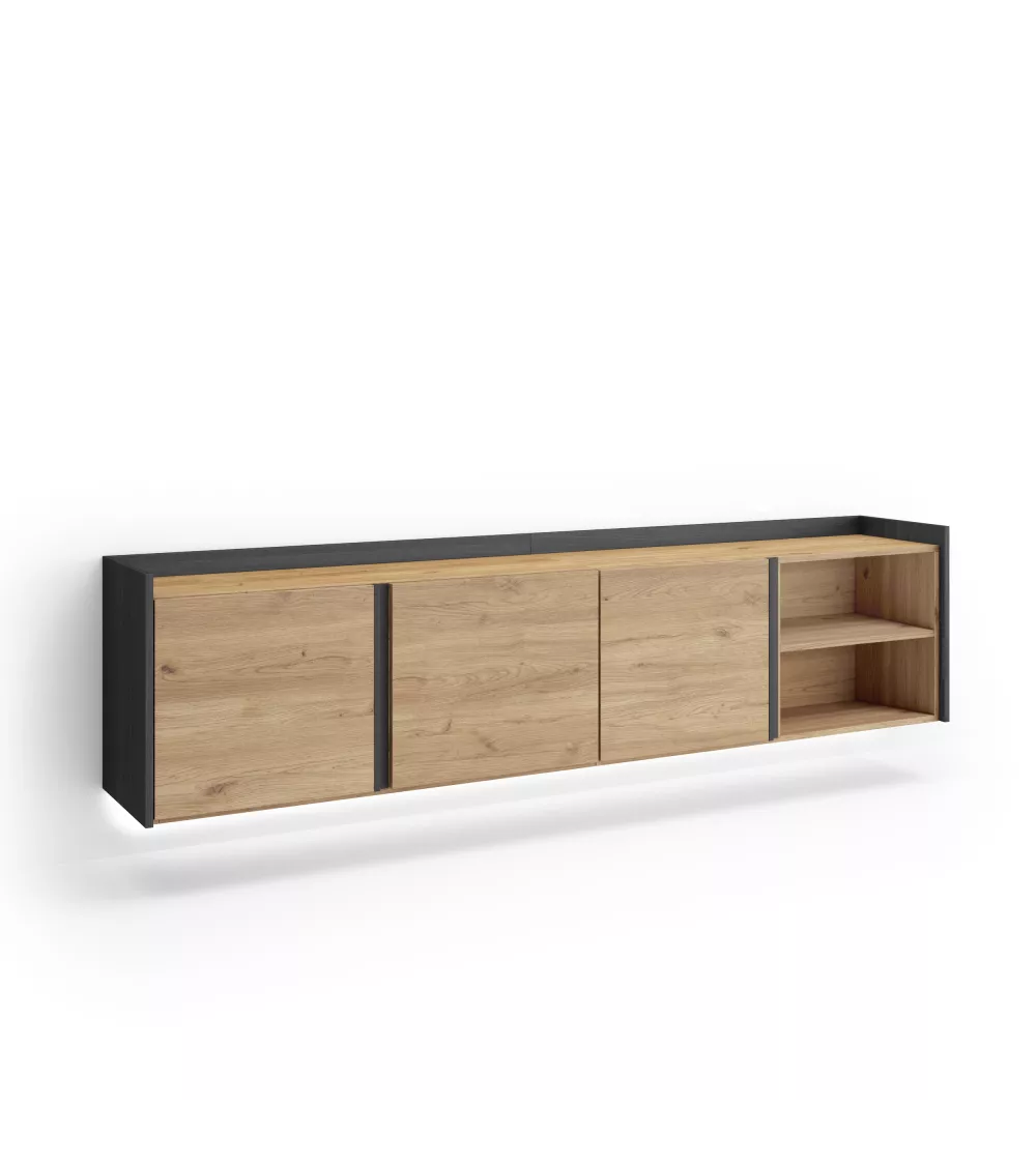 Skraut Home | Mueble TV | Televisión | Muebles de salón, almacenaje | 207x50x35 cm | Para TV hasta 80" | Colgado, Suspendido | LED | Estilo Moderno | Roble y negro