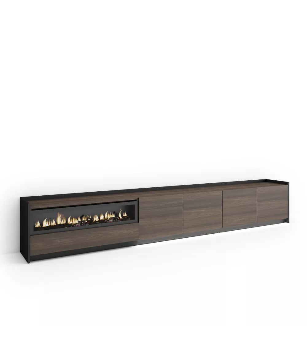 Skraut Home | Mueble TV | Televisión | Muebles de salón, almacenaje | 310x50x37 cm | Para TV hasta 80" | Chimenea eléctrica | LED | Estilo Moderno | Roble oscuro y Negro