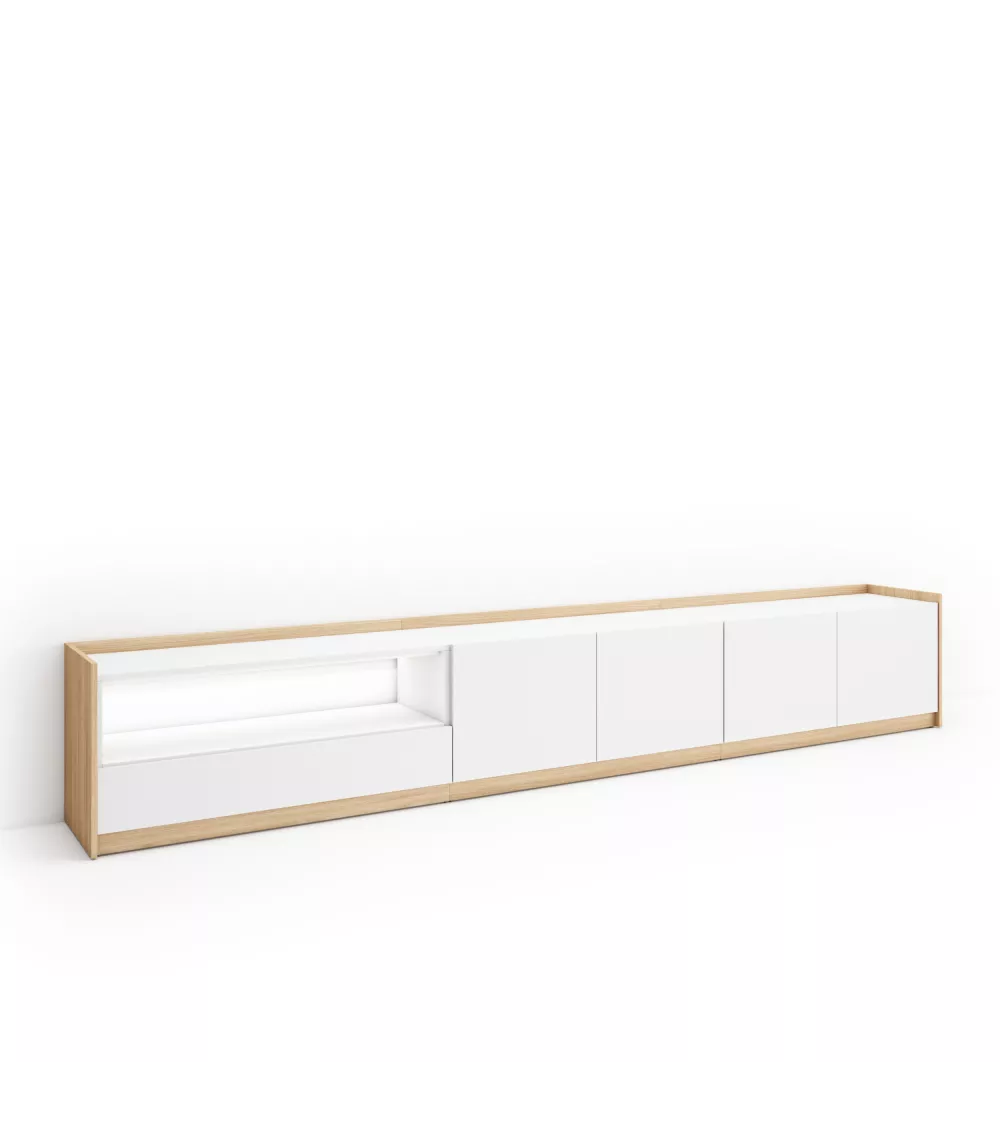 Skraut Home | Mueble TV | Televisión | Muebles de salón, almacenaje | 310x50x37 cm | Para TV hasta 80" | LED | Estilo Moderno | Blanco y roble soft