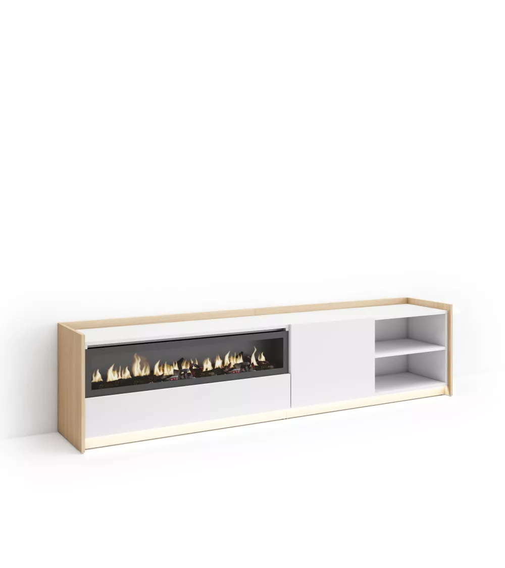 Chimenea Eléctrica LED. Medidas: 102cm. de Ancho, 21cm. de Alto. Efecto de fuego 3D increíblemente realista. Sin riesgos de quemaduras ya que no incorpora ninguna fuente de calor. Potencia: 34w. Incluye mando a distancia y 3 niveles de intensidad. La chimenea eléctrica funciona conectada a la electricidad. El mando a distancia requiere pilas, que no están incluidas. Módulo Tv con hueco para almacenar sus dispositivos electrónicos y puerta abatible. Bisagras con cierre soft. Medidas del Módulo: 104cm. de Ancho, 50cm. de Alto, 37cm. de Profundidad. Color blanco mate y roble claro con veteado de madera de tacto poroso de alta calidad. Módulo Tv con hueco y puerta abatible. Bisagras con cierre soft. Medidas del Módulo: 104cm. de Ancho, 50cm. de Alto, 37cm. de Profundidad. Color blanco y roble claro con veteado de madera de tacto poroso de alta calidad. Interruptor tactil oculto. Luz led blanco neutro, con regulador de intensidad