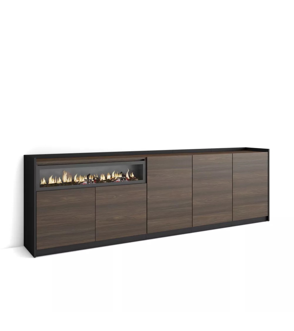 Skraut Home | Buffet salon et cuisine | Meuble de Rangement, Commode | 260x80x37 cm | 5 Portes | Cheminée électrique | Style moderne | Chêne foncé et Noir