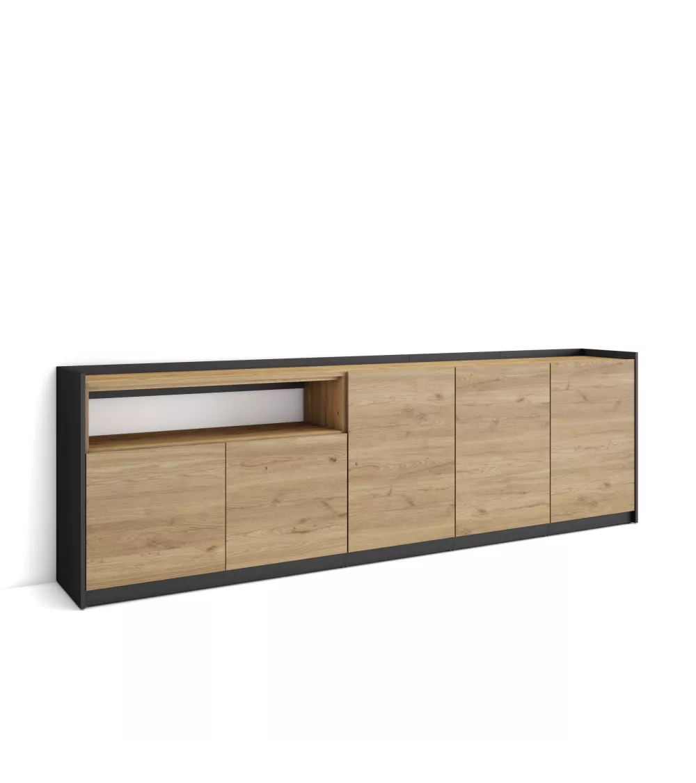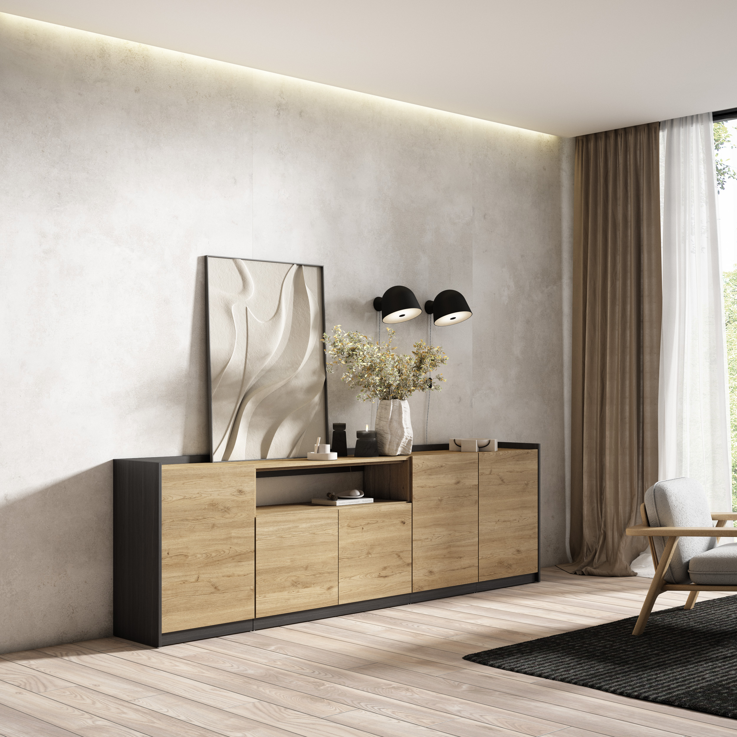 Skraut Home | Buffet salon et cuisine | Meuble de Rangement, Commode | 260x80x37 cm | 5 Portes | Meuble chaussure | Style moderne | Chêne et noir