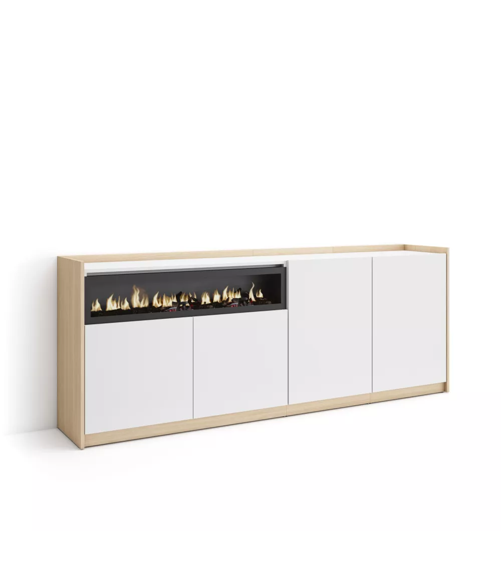 Skraut Home | Buffet salon et cuisine | Meuble de Rangement, Commode | 207x80x37 cm | 4 Portes | Cheminée électrique | Style moderne | Blanc et Chêne Soft