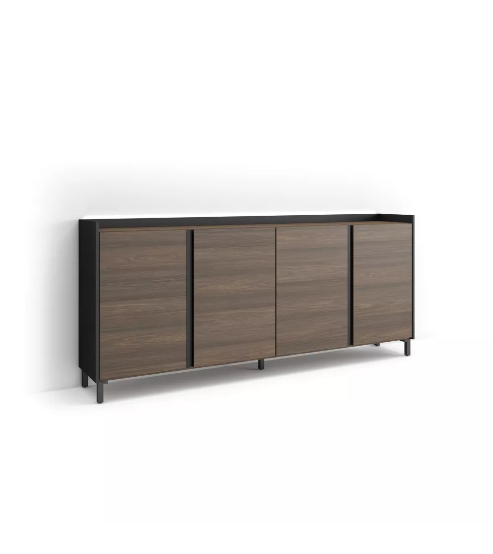 Skraut Home | Buffet salon et cuisine | Meuble de Rangement, Commode | 207x91x35 cm | 4 Portes | Design industriel | LED | Style moderne | Chêne foncé et Noir