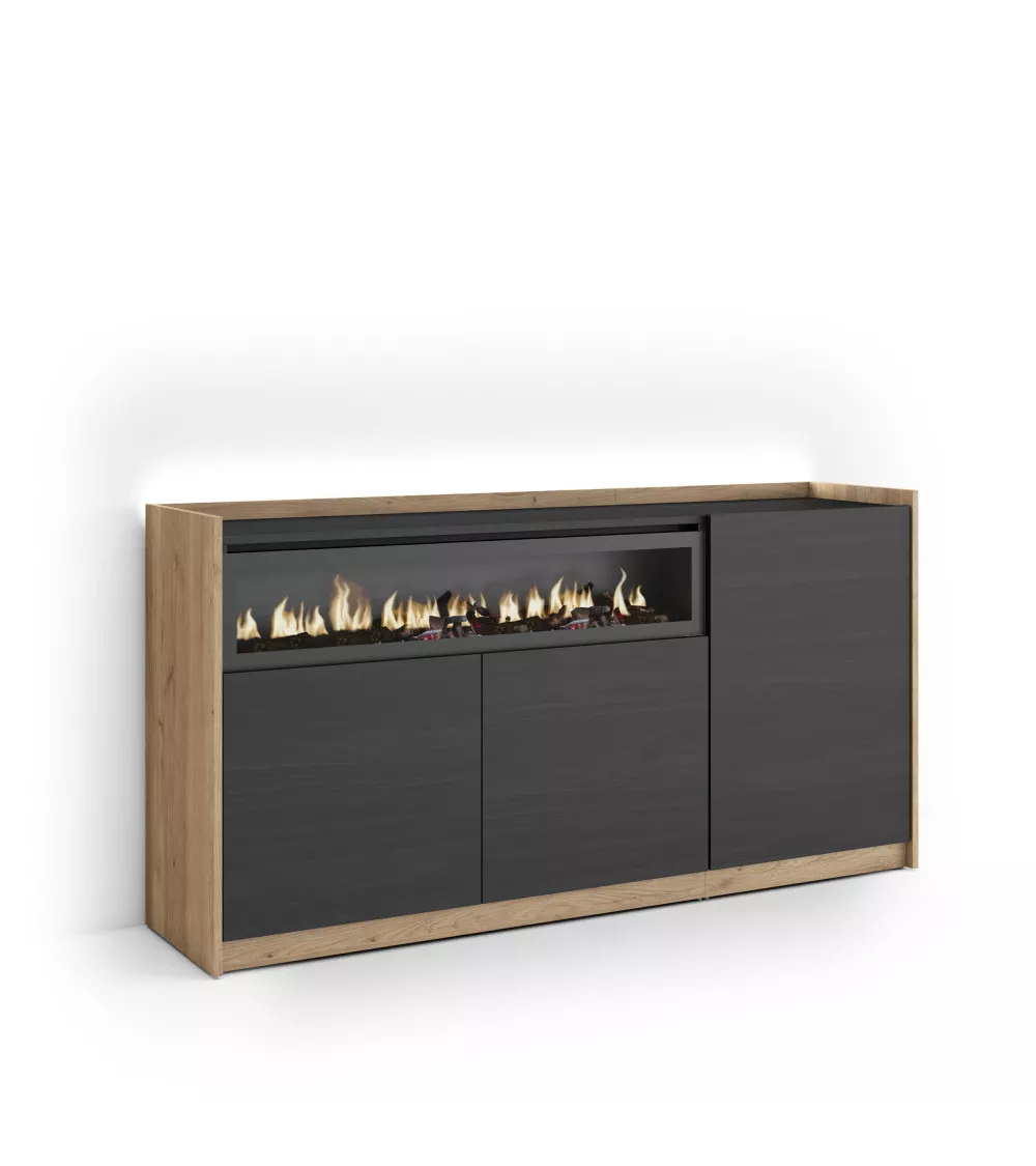 Skraut Home | Buffet salon et cuisine | Meuble de Rangement, Commode | 156x80x37 cm | 3 Portes | Cheminée électrique | LED | Style moderne | Noir et chêne