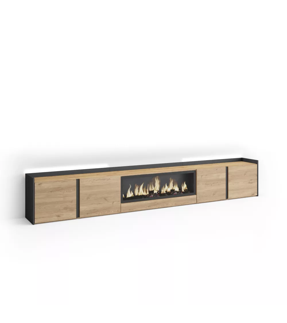 Skraut Home | Meuble TV | Banc Télé | Grand espace de Rangement | 315x50x35 cm | Pour les TV jusqu'à 80" | Cheminée électrique XXL | LED | Style moderne | Chêne et noir