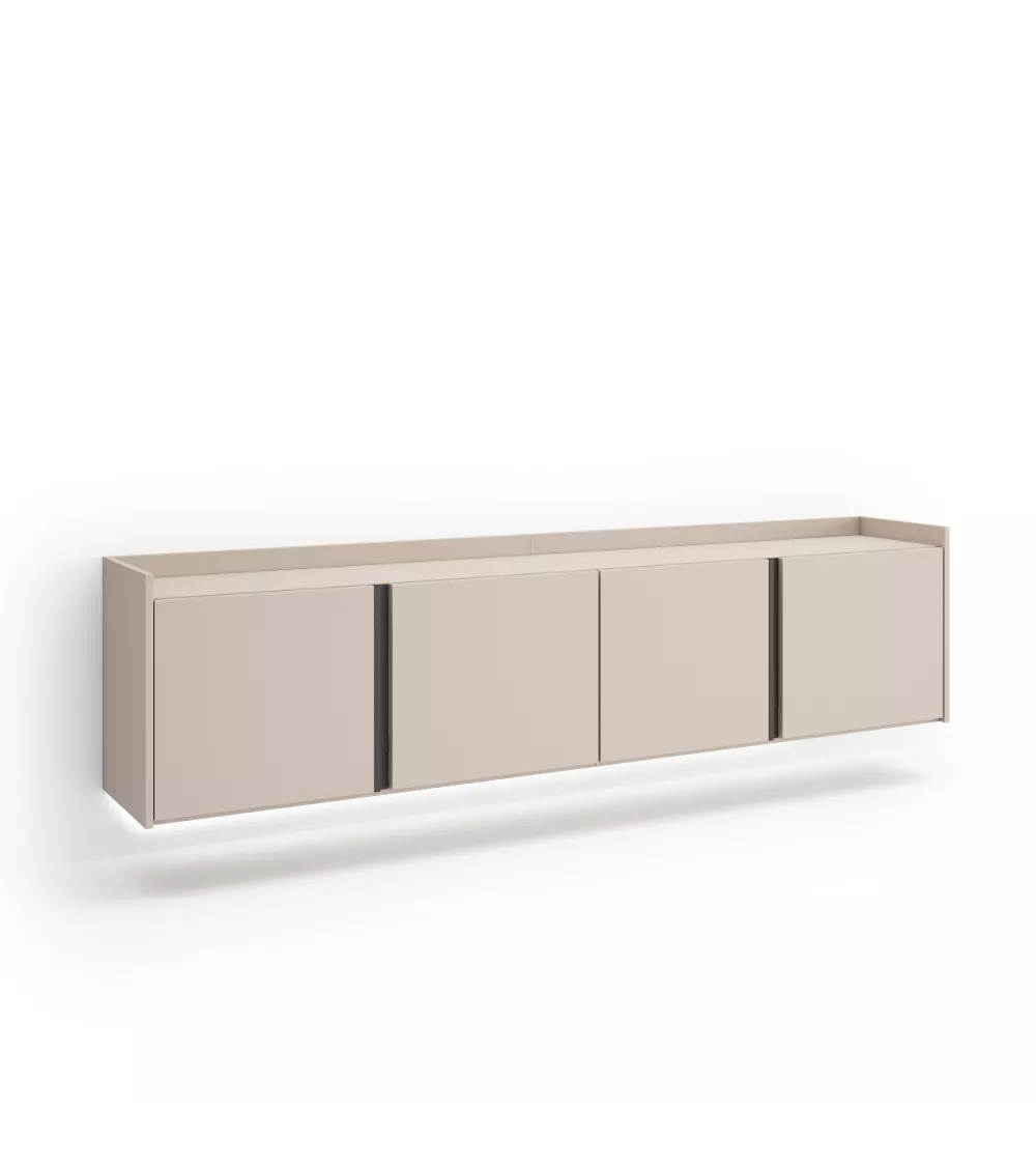Interrupteur tactile caché. Lumière LED blanche neutre, avec variateur d'intensité. Module TV avec portes battantes et grande capacité de rangement. Charnières avec fermeture soft. Poignées en aluminium. Dimensions du module : 103 cm de largeur, 50 cm de hauteur, 35 cm de profondeur. Couleur beige