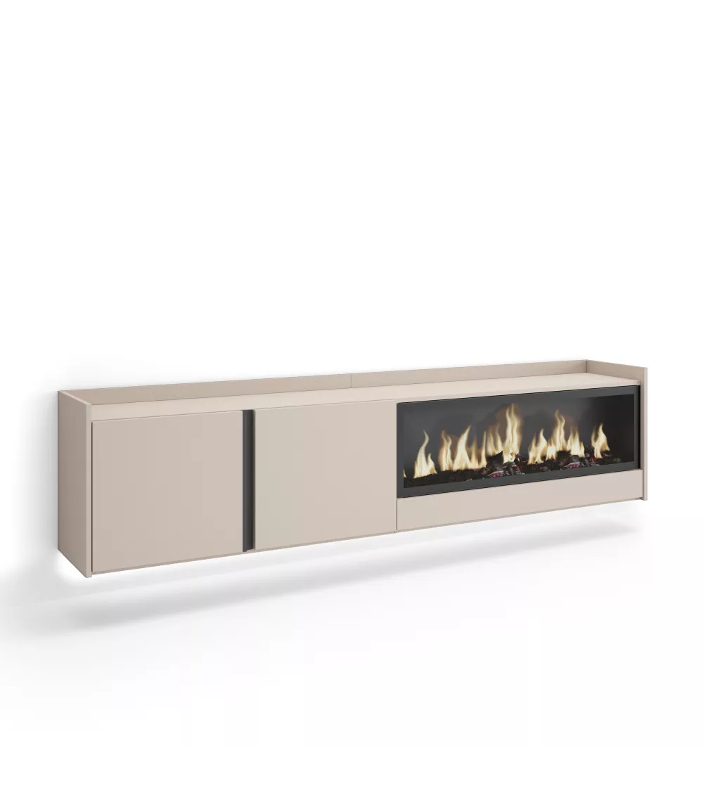 Skraut Home | Meuble TV | Banc Télé | Grand espace de Rangement | 212x50x35 cm | Pour les TV jusqu'à 80" | Cheminée électrique XXL | Suspendu, Mural | LED | Style moderne | Beige