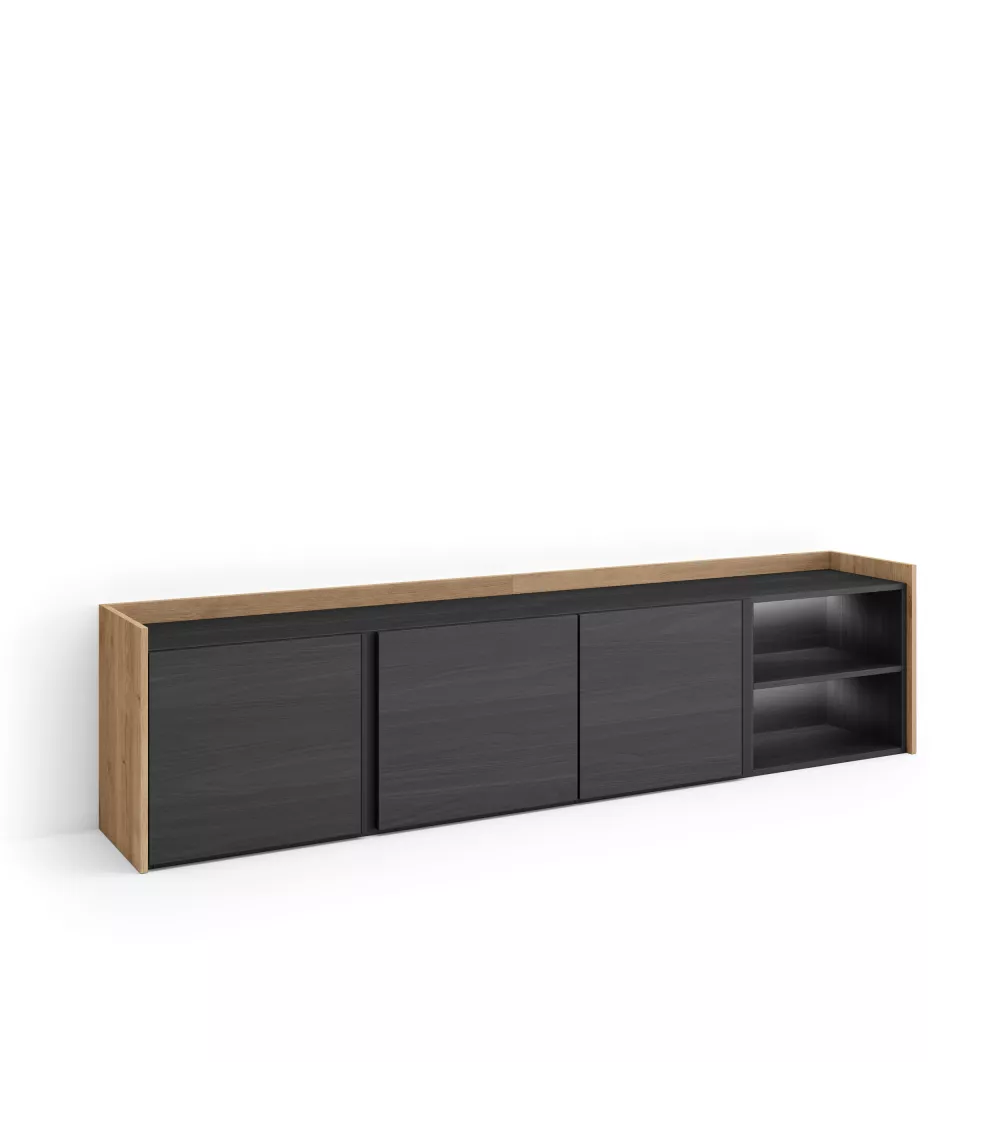 Module TV avec portes battantes et grande capacité de rangement. Charnières avec fermeture soft. Poignées en aluminium. Dimensions du module : 103 cm de largeur, 50 cm de hauteur, 35 cm de profondeur. Couleur noir et chêne avec veinures en bois poreux de haute qualité. Module TV avec espace de rangement pour vos appareils électroniques et porte rabattable. Charnières avec fermeture soft. Poignées en aluminium. Dimensions du module: 103 cm. de largeur, 50 cm. de hauteur, 35 cm. de profondeur. Couleur noir et chêne avec un veinage du bois poreux au touché de haute qualité. Interrupteur tactile caché. Lumière LED blanche neutre, avec variateur d'intensité.