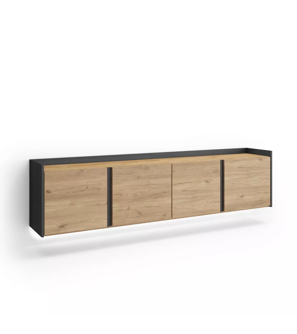 Skraut Home | Meuble TV | Banc Télé | Grand espace de Rangement | 207x50x35 cm | Pour les TV jusqu'à 80" | Suspendu, Mural | LED | Style moderne | Chêne et noir