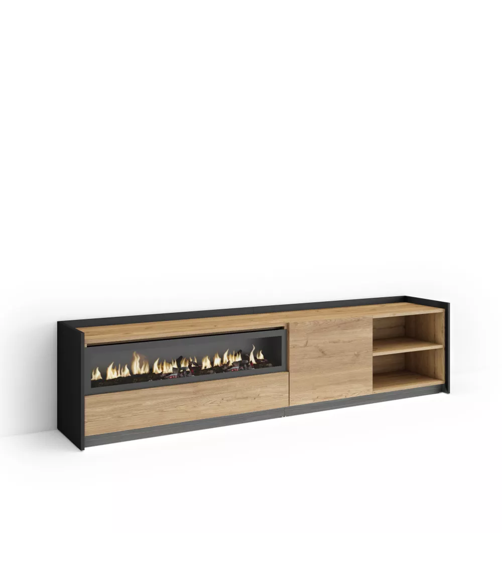 Skraut Home | Meuble TV | Banc Télé | Grand espace de Rangement | 207x50x37 cm | Pour les TV jusqu'à 80" | Cheminée électrique | LED | Style moderne | Chêne et noir