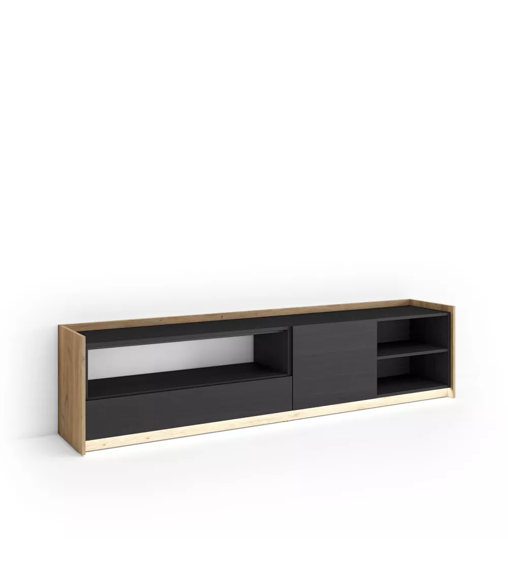 Module TV avec espace de rangement pour vos appareils électroniques et porte rabattable. Charnières avec fermeture soft. Dimensions du module: 104 cm. de largeur, 50 cm. de hauteur, 37 cm. de profondeur. Couleur noir et chêne avec un veinage du bois poreux au touché de haute qualité. Module TV avec niche et porte battante. Charnières avec fermeture soft. Dimensions du module: 104 cm. de largeur, 50 cm. de hauteur, 37 cm. de profondeur. Couleur noir et chêne avec un veinage du bois poreux au touché de haute qualité. Interrupteur tactile caché. Lumière LED blanche neutre, avec variateur d'intensité.