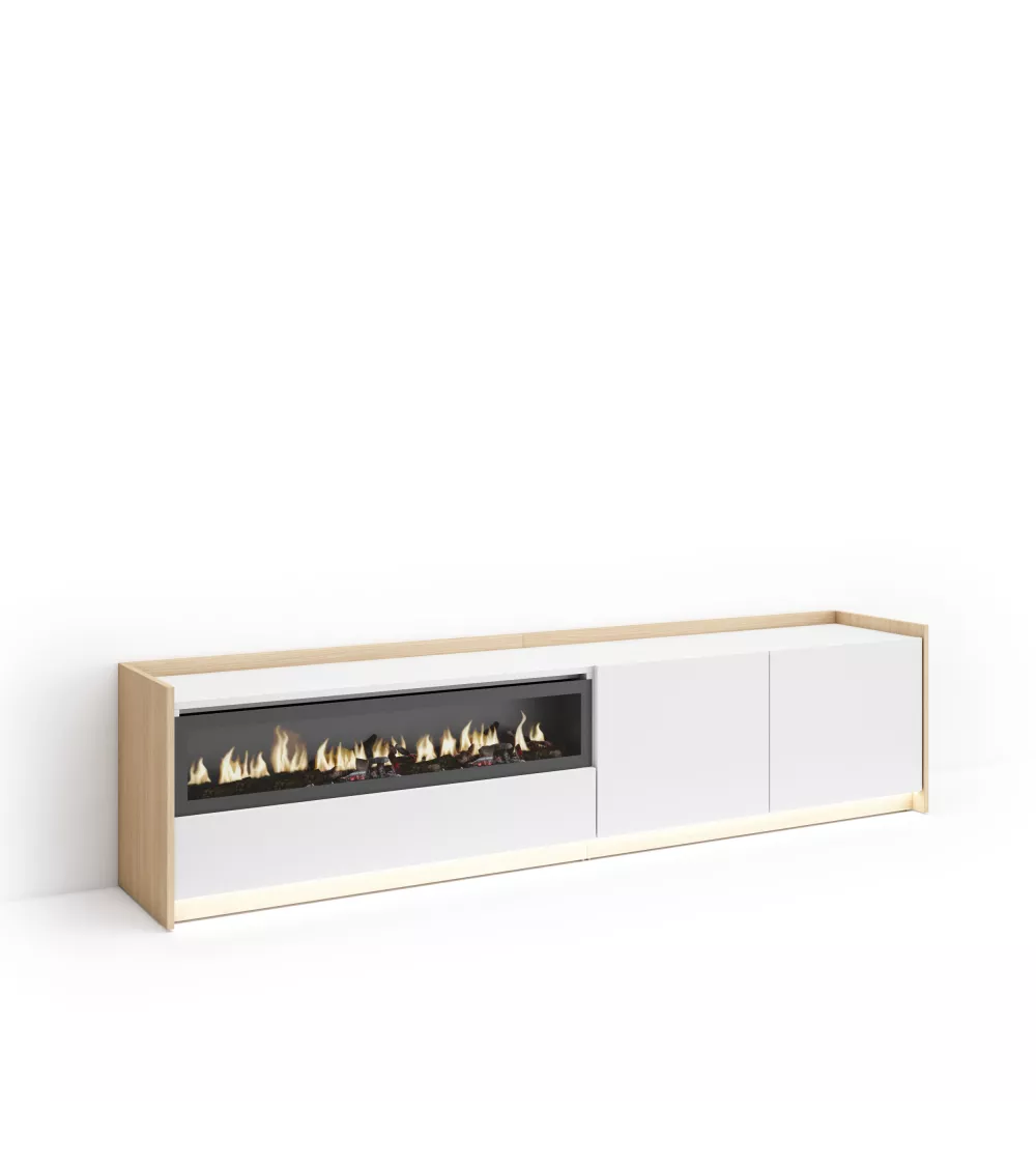 Skraut Home | Meuble TV | Banc Télé | Grand espace de Rangement | 207x50x37 cm | Pour les TV jusqu'à 80" | Cheminée électrique | LED | Style moderne | Blanc et Chêne Soft