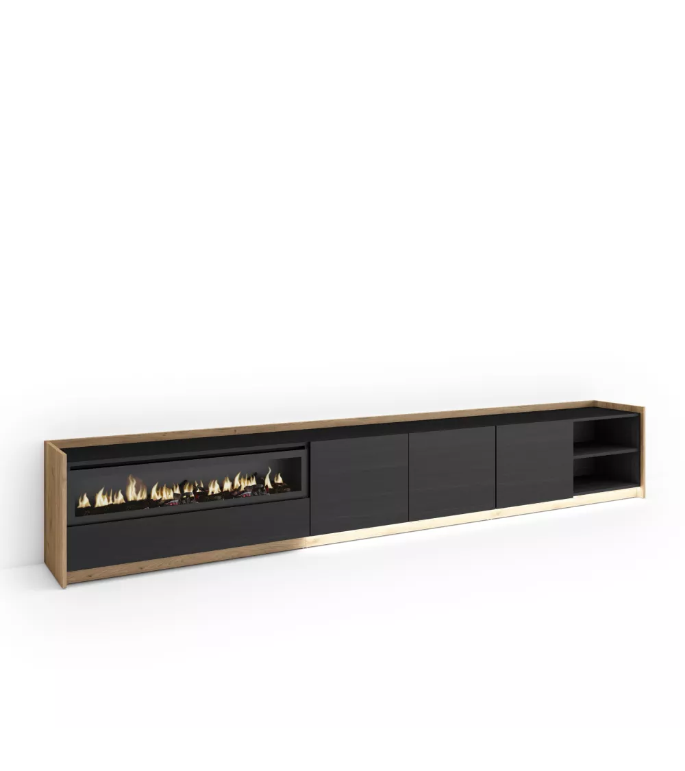 Skraut Home | Meuble TV | Banc Télé | Grand espace de Rangement | 310x50x37 cm | Pour les TV jusqu'à 80" | Cheminée électrique | LED | Style moderne | Noir et chêne