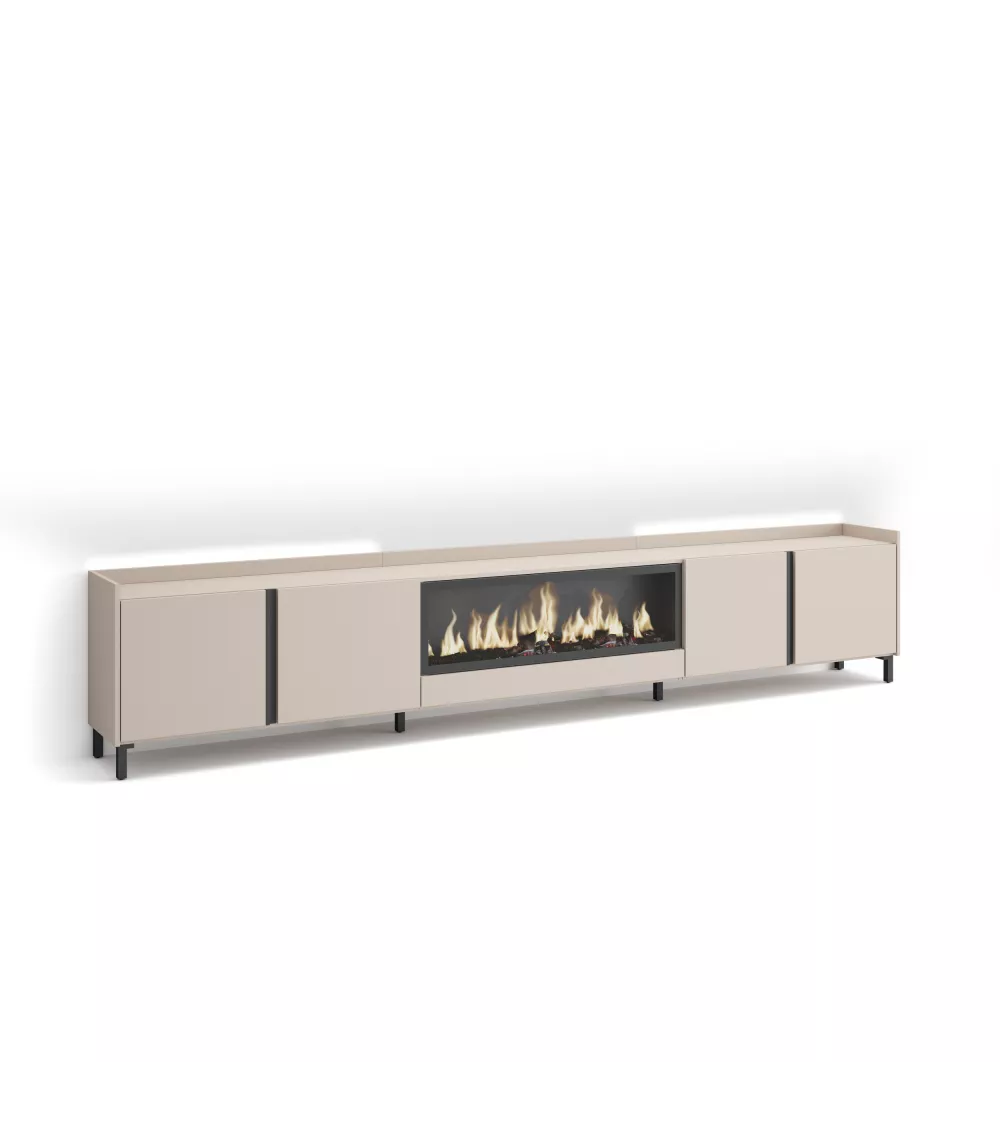 Skraut Home | Meuble TV | Banc Télé | Grand espace de Rangement | 315x61x35 cm | Pour les TV jusqu'à 80" | Cheminée électrique XXL | Design industriel | LED | Style moderne | Beige