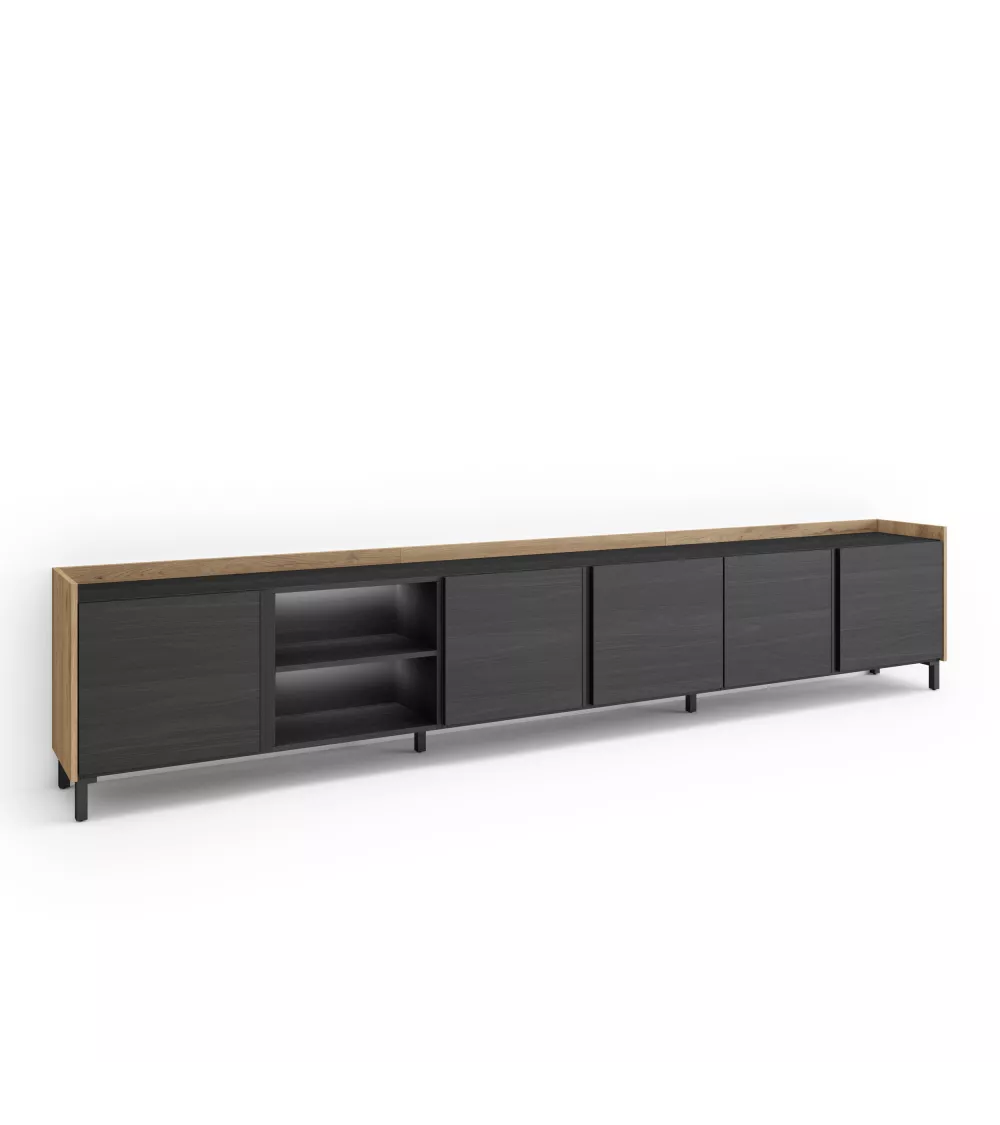 Skraut Home | Meuble TV | Banc Télé | Grand espace de Rangement | 309x61x35 cm | Pour les TV jusqu'à 80" | Design industriel | LED | Style moderne | Noir et chêne
