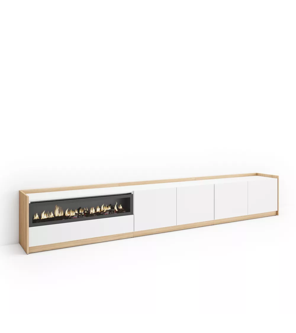 Skraut Home | Meuble TV | Banc Télé | Grand espace de Rangement | 310x50x37 cm | Pour les TV jusqu'à 80" | Cheminée électrique | Style moderne | Blanc et Chêne Soft