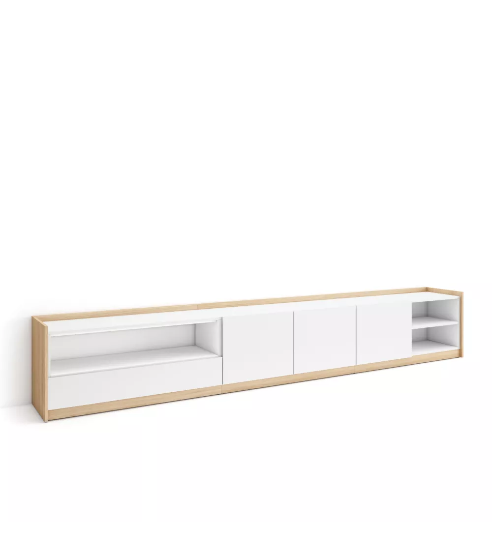 Skraut Home | Meuble TV | Banc Télé | Grand espace de Rangement | 310x50x37 cm | Pour les TV jusqu'à 80" | Meubles de salon | Style moderne | Blanc et Chêne Soft