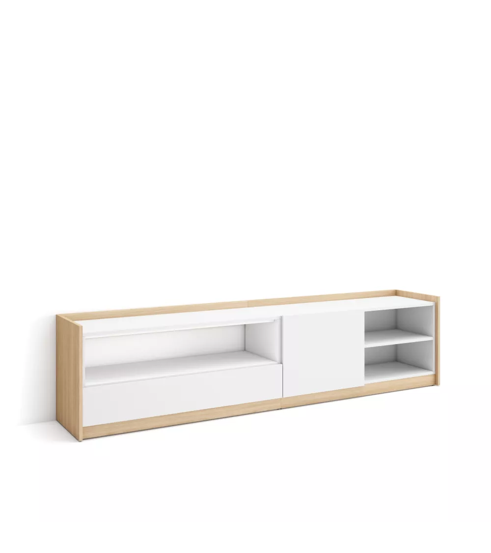 Skraut Home | Meuble TV | Banc Télé | Grand espace de Rangement | 207x50x37 cm | Pour les TV jusqu'à 80" | Meubles de salon | Style moderne | Blanc et Chêne Soft