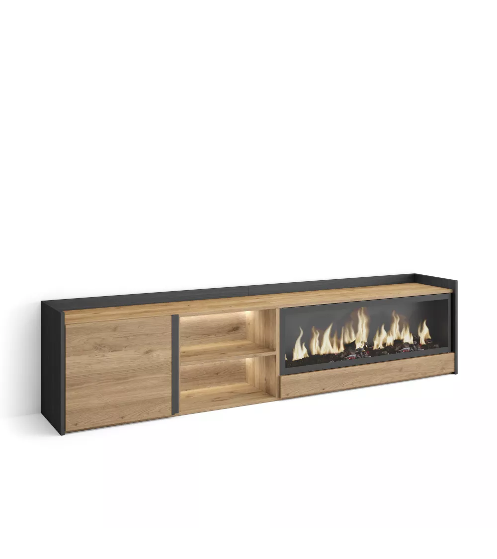 Skraut Home | Meuble TV | Banc Télé | Grand espace de Rangement | 212x50x35 cm | Pour les TV jusqu'à 80" | Cheminée électrique XXL | LED | Style moderne | Chêne et noir
