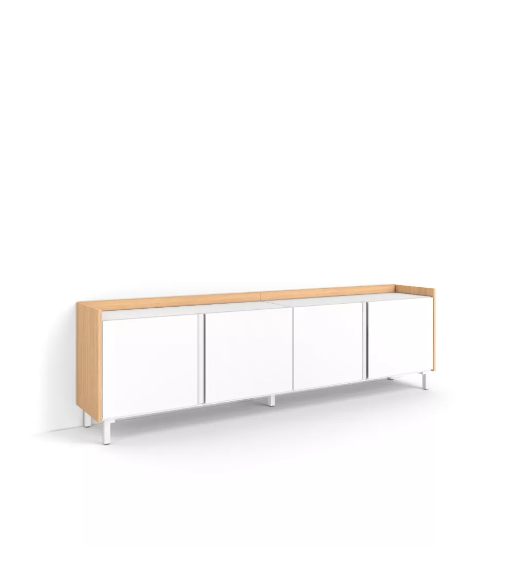 Module TV avec portes battantes et grande capacité de rangement. Charnières avec fermeture soft. Poignées en aluminium. Dimensions du module : 103 cm de largeur, 50 cm de hauteur, 35 cm de profondeur. Couleur blanc mat et chêne clair avec veinage bois au toucher poreux de haute qualité. Pied de 10,5 cm réglable en hauteur. Couleur blanche.