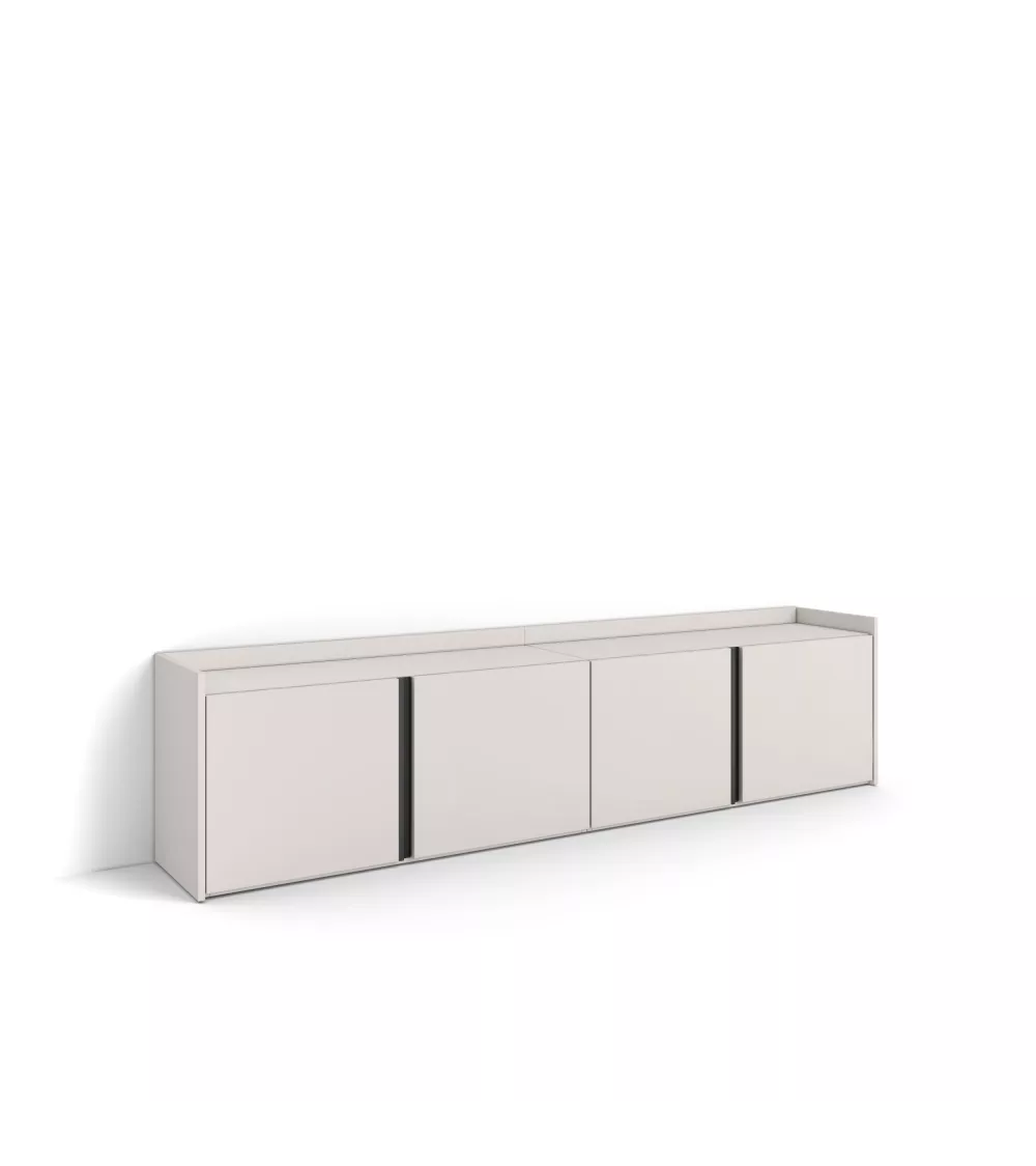 Module TV avec portes battantes et grande capacité de rangement. Charnières avec fermeture soft. Poignées en aluminium. Dimensions du module : 103 cm de largeur, 50 cm de hauteur, 35 cm de profondeur. Couleur beige