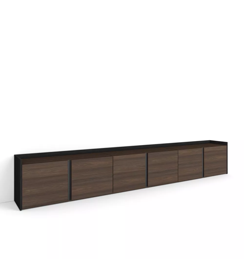 Module TV avec portes battantes et grande capacité de rangement. Charnières avec fermeture soft. Poignées en aluminium. Dimensions du module : 103 cm de largeur, 50 cm de hauteur, 35 cm de profondeur. Couleur chêne foncé et noir avec veinage bois poreux de haute qualité.